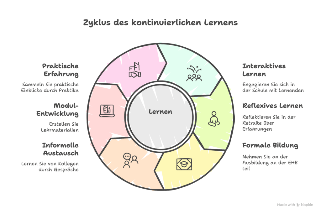 Gedanken: Ich lerne mitten im Leben, in der Schule interaktiv mit und von meinen Lernenden und immer wieder reflektierend in meiner Retraite im Brachli. Und dann natürlich auch anhand meiner Ausbildung an der EHB. Dabei nutze ich als Quellen meine Lehrerkollegen im informellen Austausch, meine Beschäftigung bei der Erstellung von Modulunterlagen und auch das Praktikum in Baden.